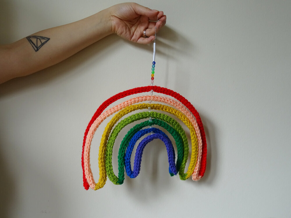 Using the needle, attach and knot thread to the bottom arc of the rainbow (ideally around the wire). With thread coming out of the top of the arc, place beads. Continue feeding thread through the center of each arc and placing beads. This spaces each arc evenly. I put more beads at the top before knotting in a loop to hang.