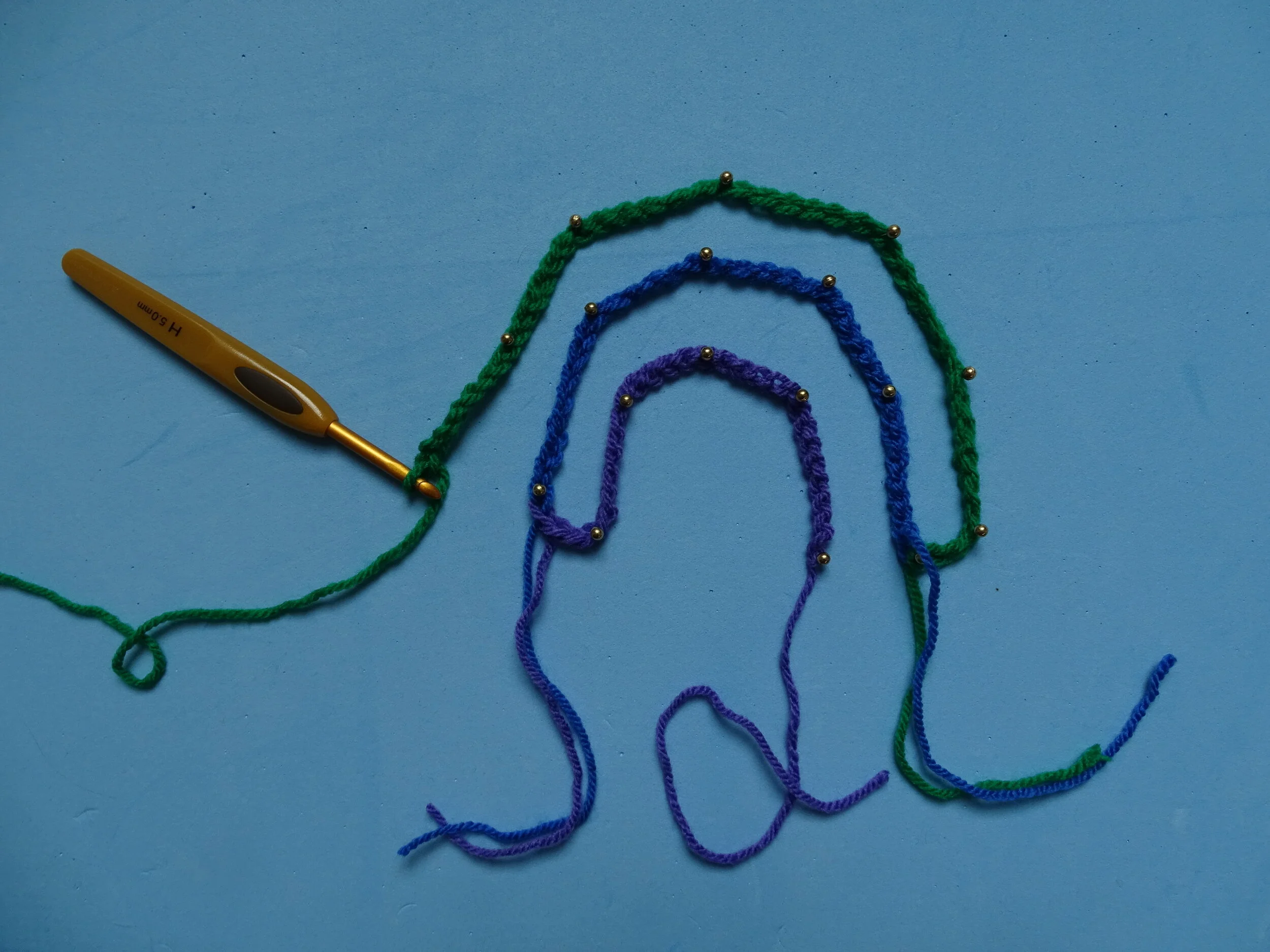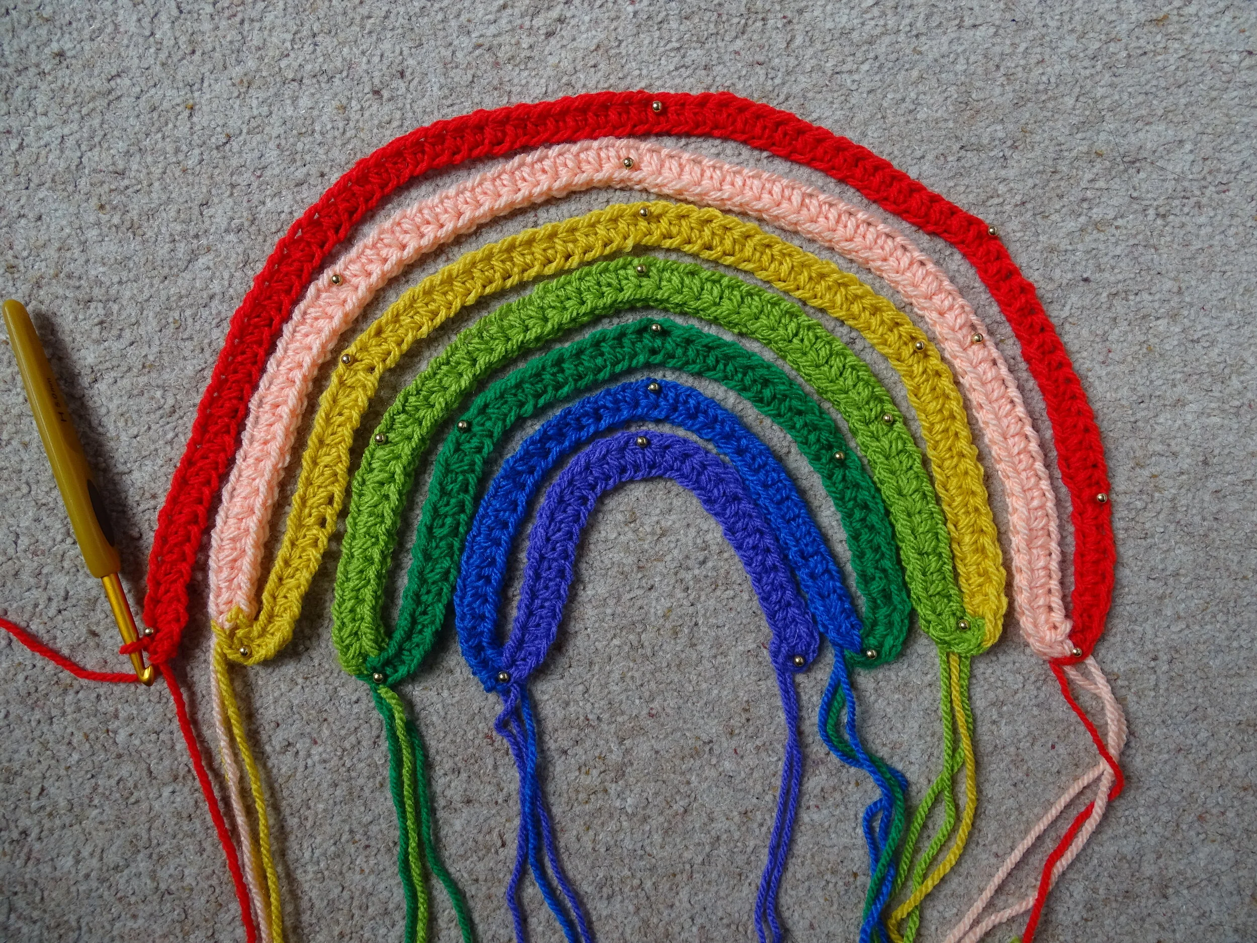 To get the length of the chain correct, I frequently previewed the rainbow by pinning the chain to a mat, leaving a bit of space between each color.