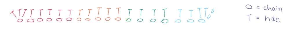 Ch 2 (counts as hdc), 2 hdc in first ch, hdc across to end of chain. Change the color of your yarn to whatever color the chain is, cutting the old yarn as you go. 3 hdc in the last ch and do not cut final yarn.