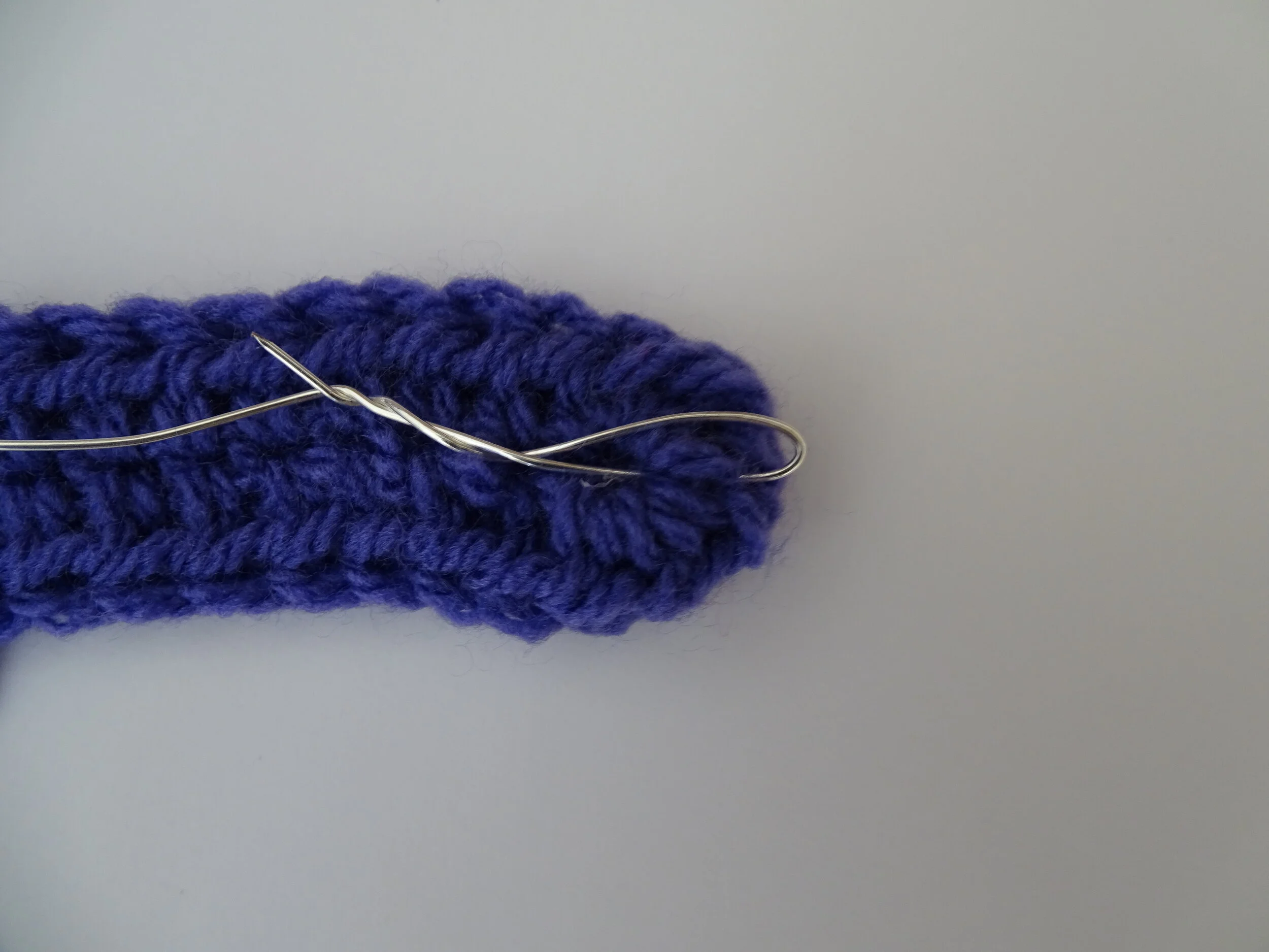 Cut yarn with generous tail. With the tapestry needle, loop the yarn into and around the wire to hide the wire. Do the same on the other side.