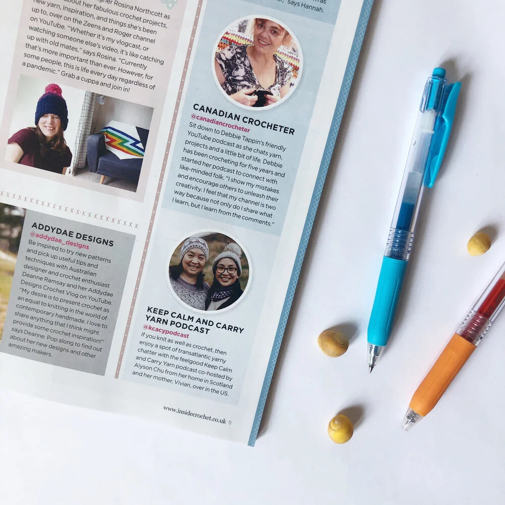 Keep Calm and Carry Yarn, the podcast I host with my mom, was featured in the latest issue of Inside Crochet! I’m still doing somersaults inside my head because I can hardly believe, what started as a fun project between me and my mom has lead us here. And by “here,” I mean published in a magazine, but also still podcasting over three years later for our small but lovely audience. And if it weren’t for the podcast, I probably wouldn’t have become so in love with crochet, or have begun my designing journey!